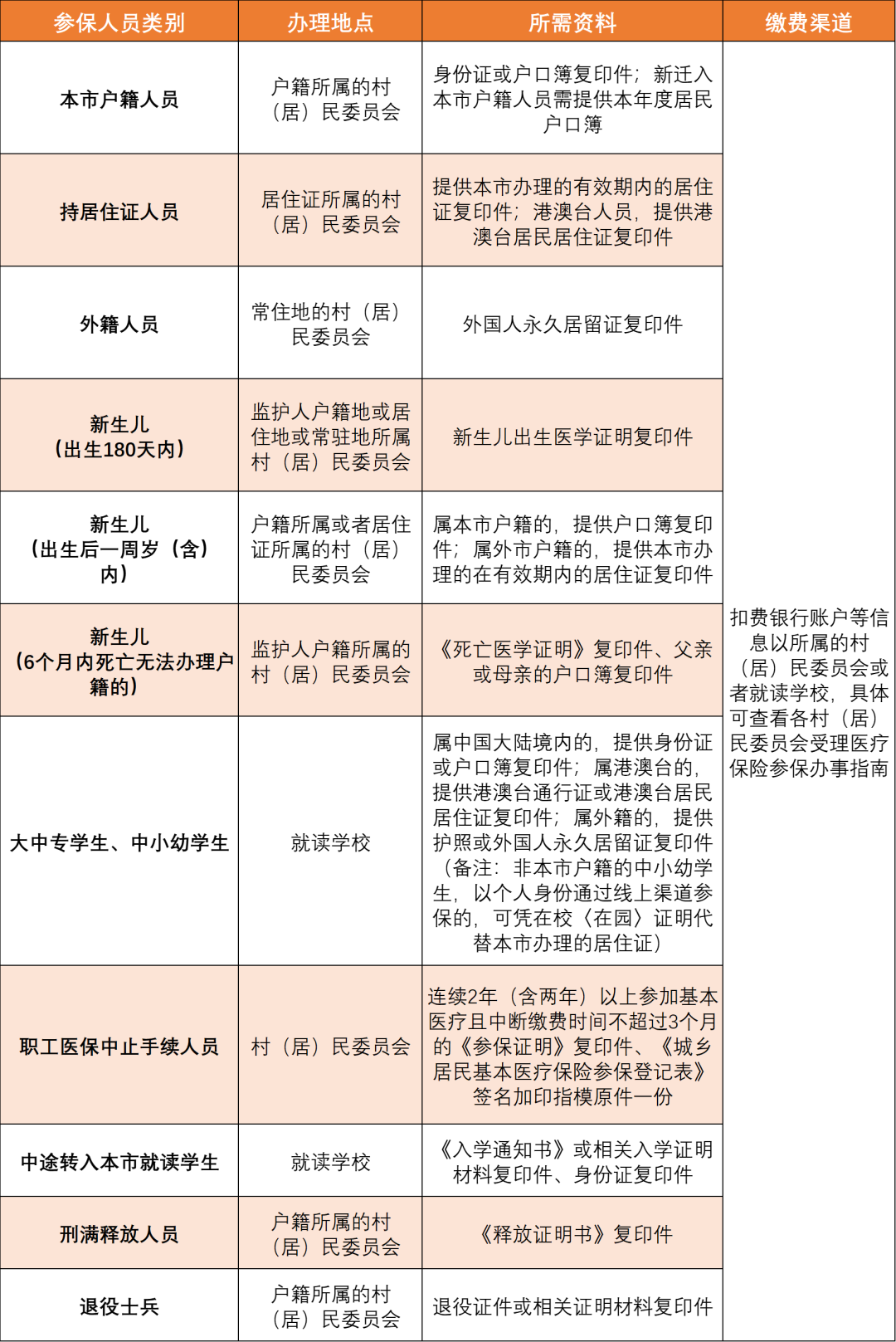 3.职工医保中止手续的人员(符合连续两年(含两年)以上参加基本医疗保险且中断缴费不超过3个月)、新迁入本市户籍人员、当年度新办理本市居住证人员、中途转入本市就读学生、刑满释放人员、退役士兵