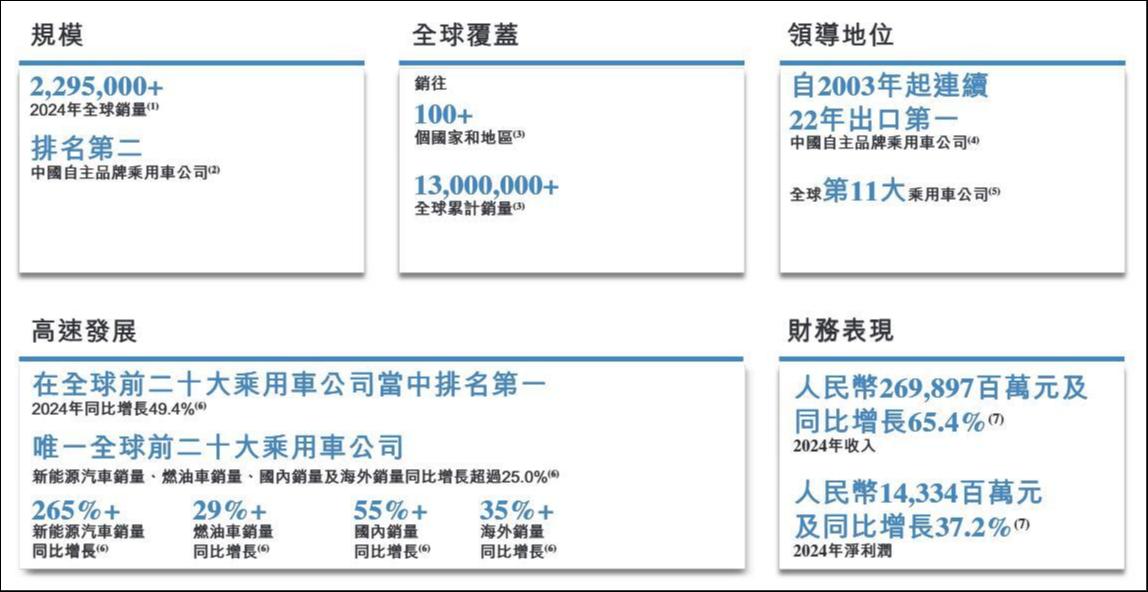 凭借高端新能源车型的推出,奇瑞快速抢占市场心智。招股书显示,2024年,奇瑞在中国乘用车销量较2023年增长56.0%;其中,新能源汽车销量较2023年增长277.3%。根据弗若斯特沙利文的资料,2024年奇瑞燃油车和新能源汽车于中国销量的同比增速在中国前十大乘用车公司中均排名第一。