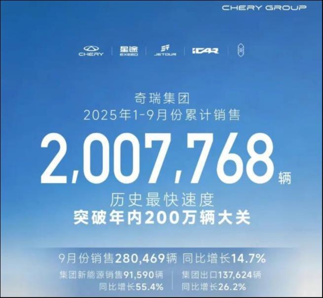 根据奇瑞官微10月2日公布的销量数据,奇瑞集团9月销售汽车280,469辆,同比增长14.7%;前三季度集团累计销售汽车2,007,768辆,同比增长14.5%,以历史最快速度突破年内200万辆大关,创历史新高。
